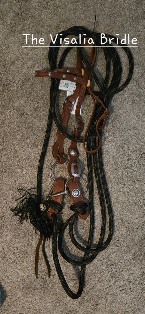 - Visalia Bridle Set: Comes with snaffle bit, Herman Oak leather bridle (medium oil/brown) wth silver conchos and engraved buckles/hardware, Herman Oak leather slobber straps with silver conchos, 25 ft 4 strand braided yacht line mecate style reins with leather “knot” and “popper.”A beautiful and unique set! $235.00 (plus shipping if needed).