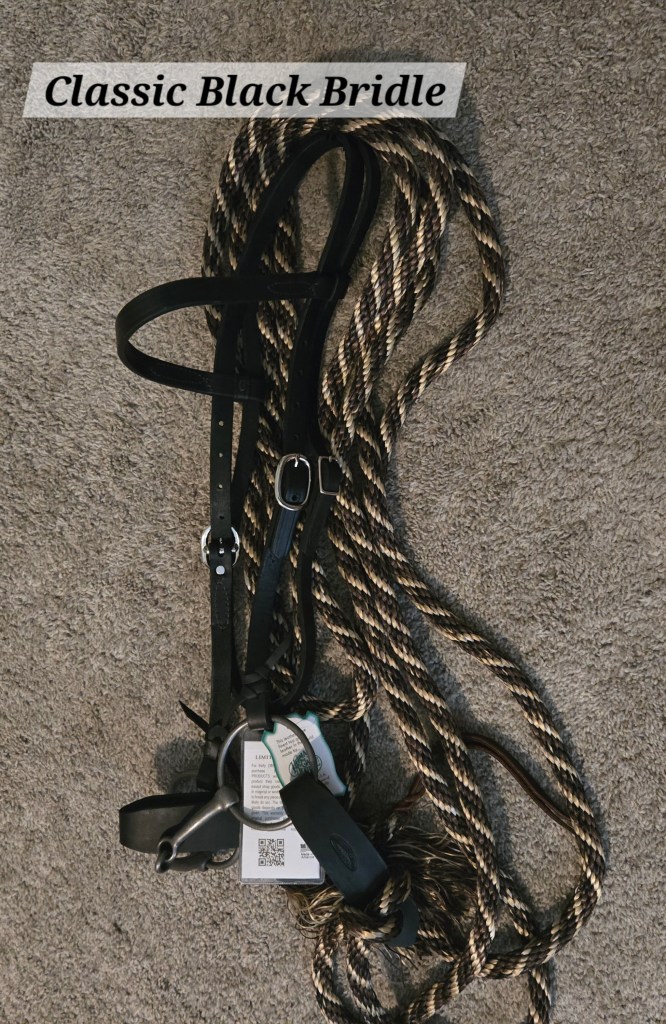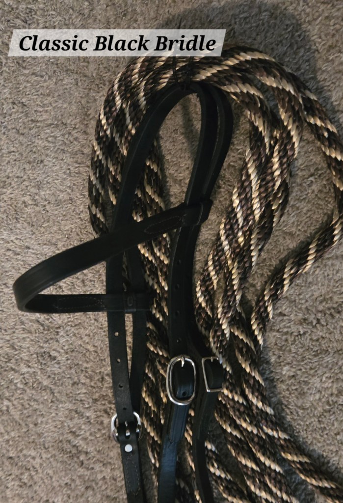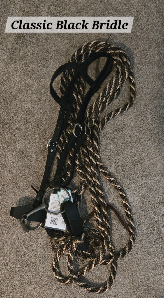 - Black Beauty Bridle Set: Comes with snaffle bit, Herman Oak leather bridle (black), Herman Oak leather slobber straps, 25 ft 4 strand braided yacht line mecate style reins with leather “knot” and “popper.” $165.00 (plus shipping if needed).