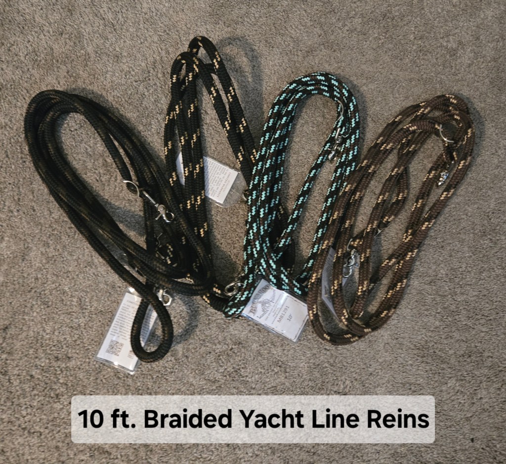 - 10 ft. 4 strand braided yacht line Train Reins with clips. These have great feel and contact: $35.00 (plus shipping if needed).